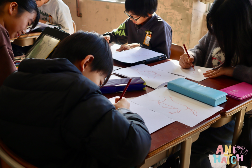 Once the drawings were finished, each one was photographed frame by frame. Finally, the entire class gathered to watch the completed works. The moment the play button was pressed and their horses began to gallop powerfully across the screen, the classroom erupted in excitement.