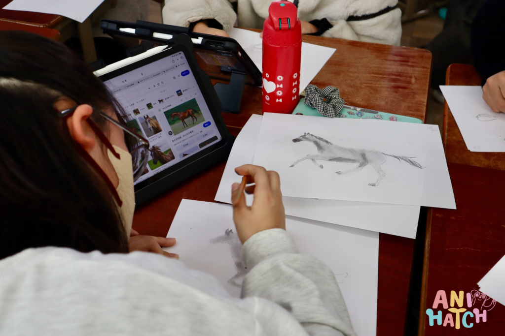 再生ボタンを押した瞬間、自分たちが描いた馬が画面の中で力強く走り出す様子を見て、教室中が大盛り上がりのうちに授業が終了しました。